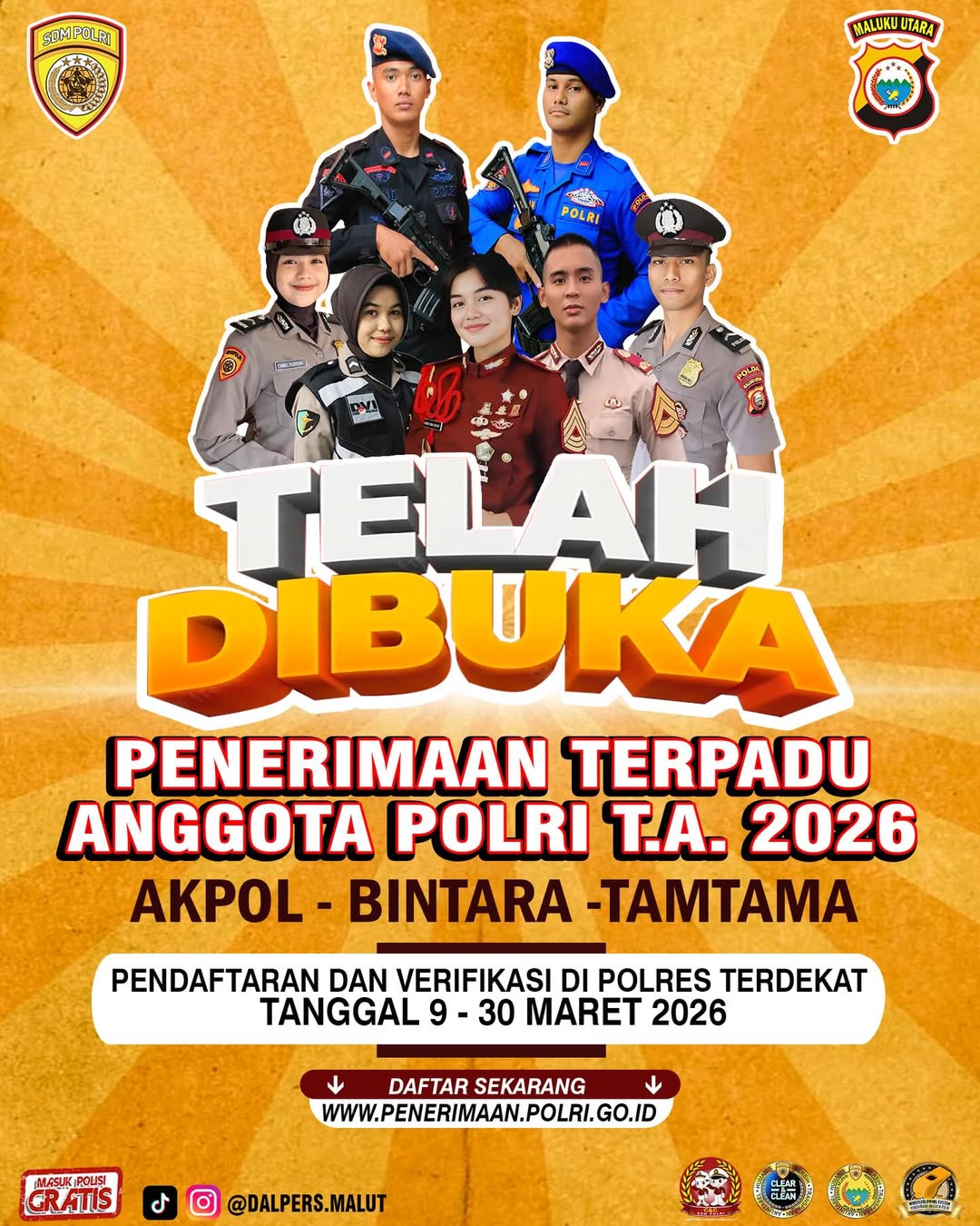 Faduli1.com-Kepolisian Negara Republik Indonesia (Polri) melalui Kepolisian Daerah (Polda) Maluku Utara kembali membuka kesempatan bagi putra-putri terbaik bangsa untuk bergabung dan berkarier sebagai anggota Polri melalui penerimaan terpadu Tahun Anggaran 2026.