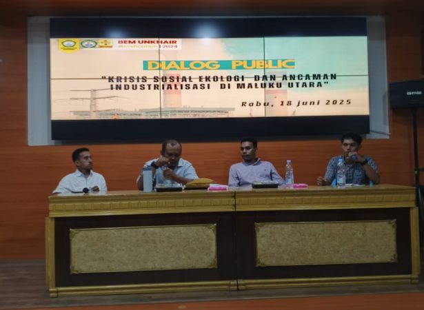 FaduliNews.com | TERNATE — Badan Eksekutif Mahasiswa (BEM) Universitas Khairun Ternate menggelar dialog publik bertajuk “Krisis Sosial Ekologi dan Ancaman Industrialisasi Pertambangan di Maluku Utara”, Rabu (18 Juni 2025), bertempat di Aula Babullah Universitas Khairun.