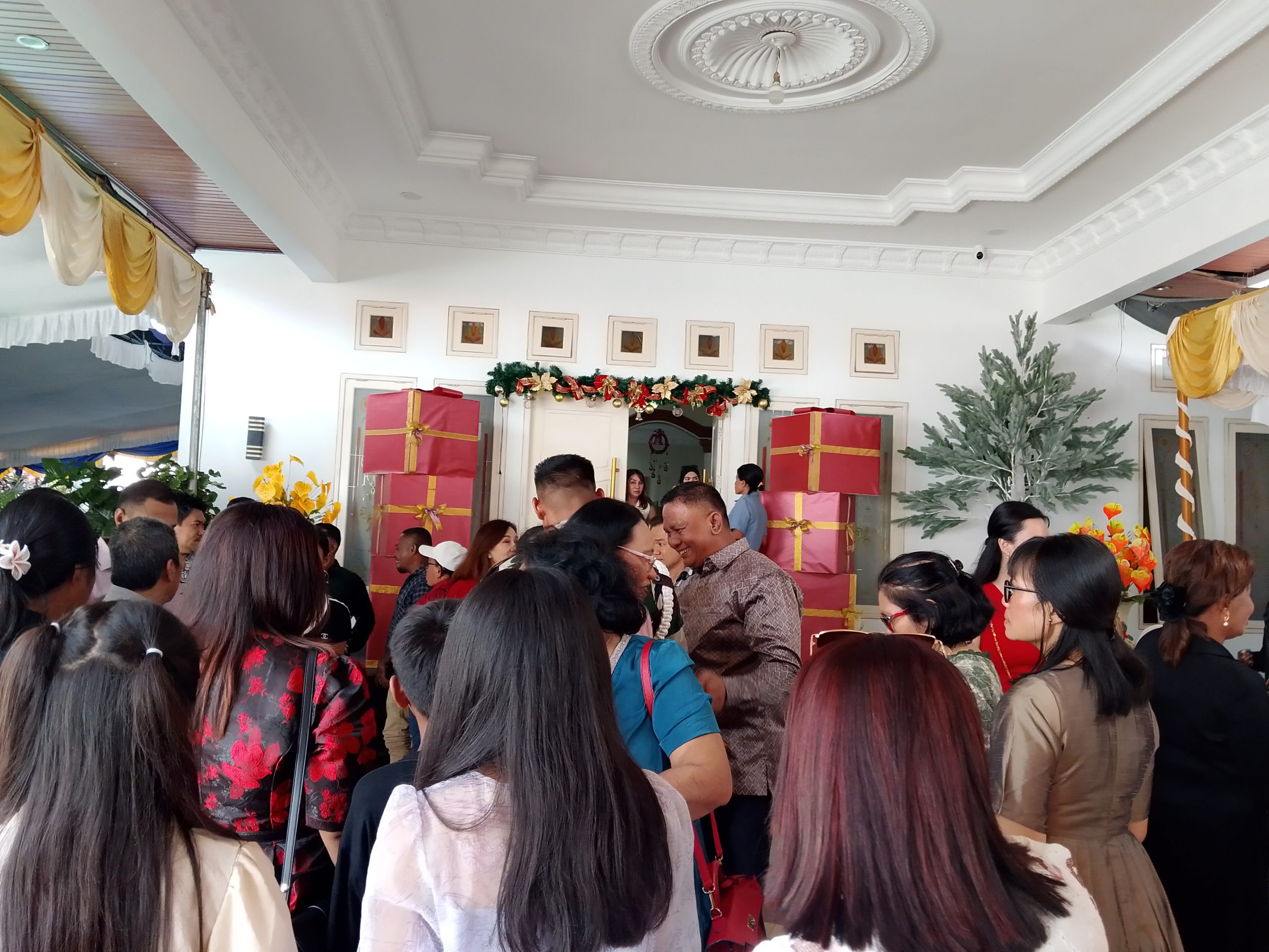 Kemeriahan semakin terasa ketika seorang tamu dari luar negeri turut hadir menyampaikan ucapan selamat Natal kepada Bupati dan keluarga. Kehadirannya menarik perhatian warga yang sejak pagi memenuhi tenda berwarna kuning keemasan di halaman rumah.