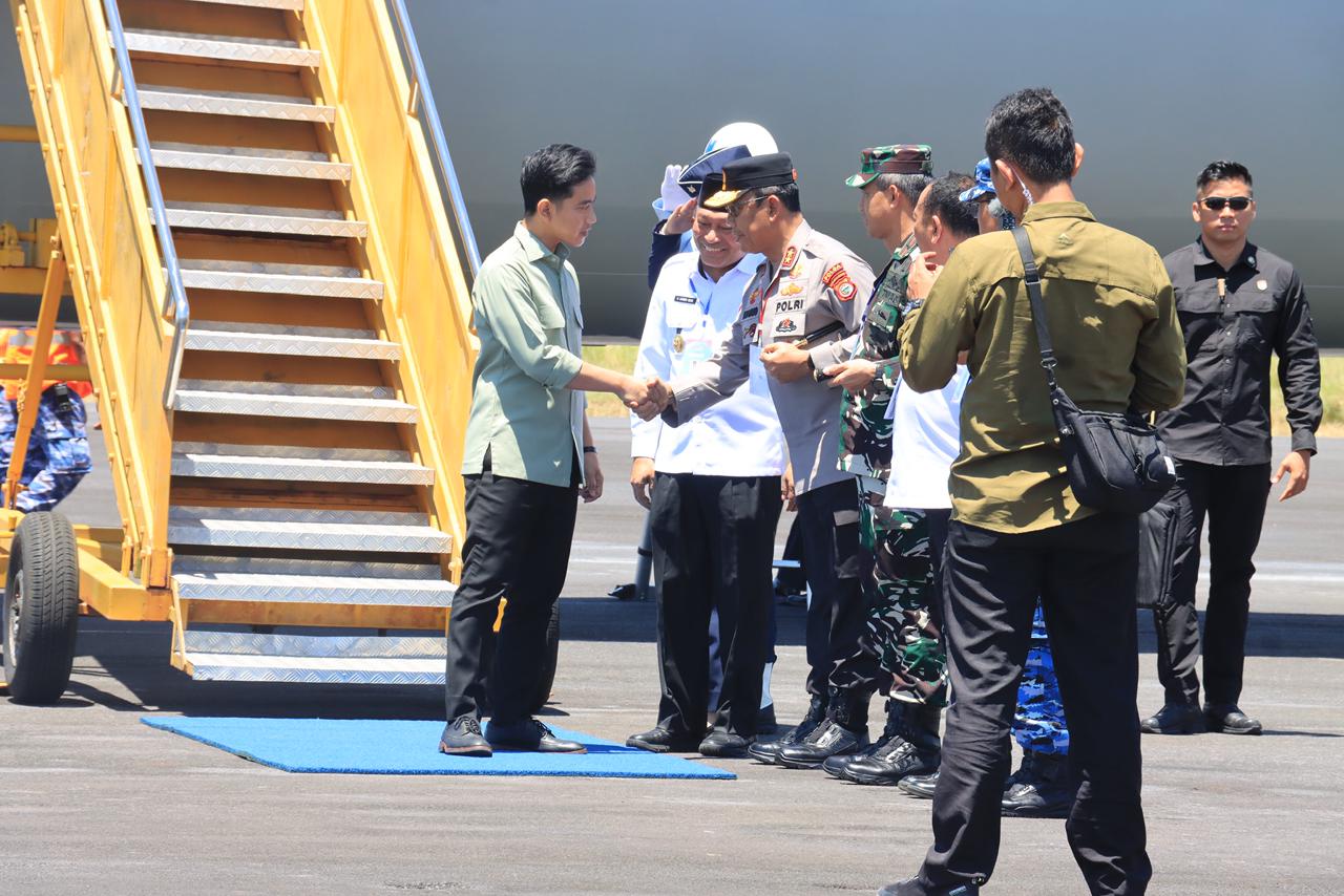 FaduliNews_Kapolda Maluku Utara Irjen Pol Drs. Waris Agono, M.Si menyambut hangat kedatangan Wakil Presiden Republik Indonesia Bapak Gibran Rakabuming Raka beserta rombongan di Bandara Pitu, Desa Wawama, Kecamatan Morotai Selatan, Kabupaten Pulau Morotai, Rabu (15/10).