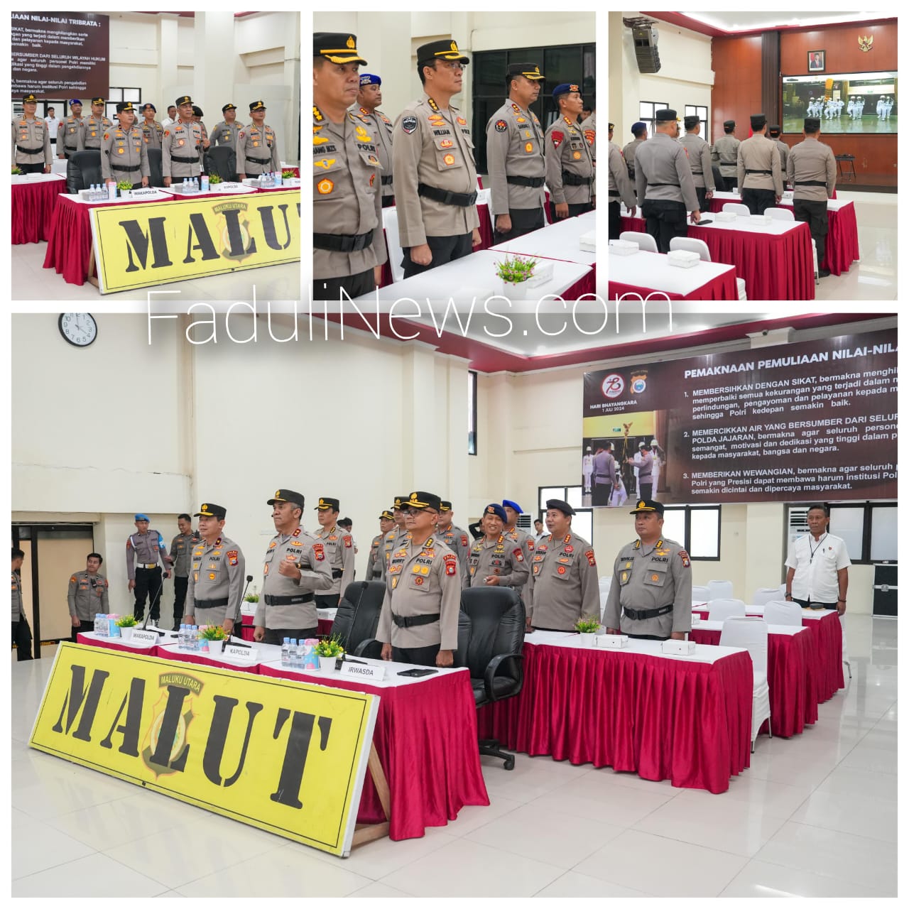 Ternate-FN, Rabu/19-06-2024 Kapolda Maluku Utara, Irjen Pol. Midi Siswoko, S.I.K, mengikuti upacara pemuliaan nilai-nilai Tribrata di Aula Kieraha Polda Malut. Acara ini merupakan bagian dari peringatan ke-78 Hari Bhayangkara.Rabu (19/06/2024)