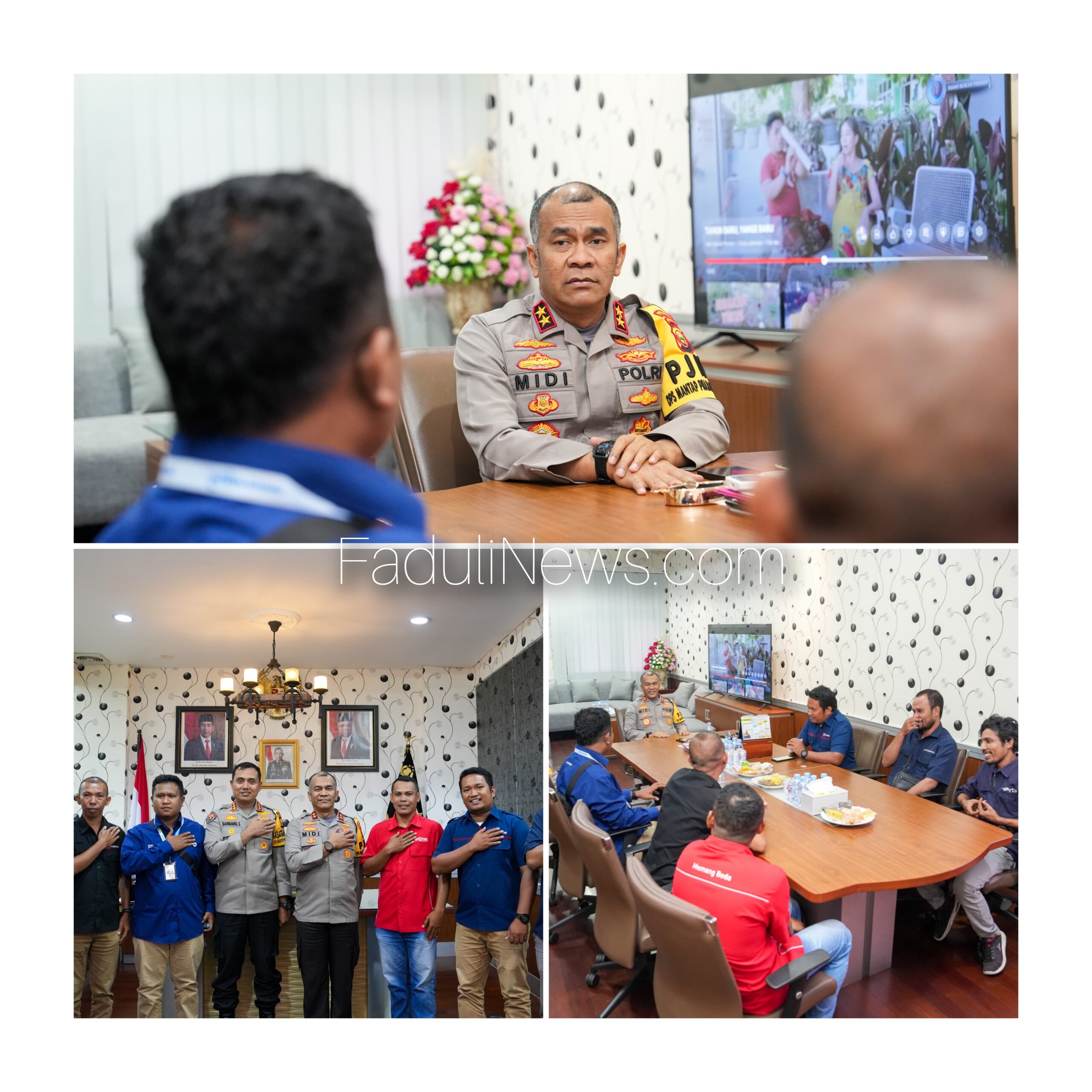 MALUT-FN/Senin,12/8/2024,Kapolda Maluku Utara, Irjen Pol. Midi Siswoko, S.I.K., menerima kunjungan dari wartawan media televisi Maluku Utara di ruang kerjanya. Hadir juga Kabidhumas Polda Malut Kombes Pol. Bambang Sujaryono, S.I.K., M.H., dan beberapa wartawan televisi.