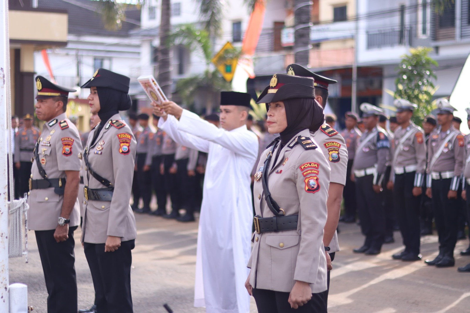 Upacara yang berlangsung khidmat ini dihadiri oleh para perwira, personel satuan fungsi, serta staf Polres Ternate. Turut hadir dalam jajaran perangkat upacara antara lain AKP Andi Idrus N. A. Collong, S.H., sebagai Perwira Upacara, dan Ipda Naufal Fajar Zahira, S.Tr.K., sebagai Komandan Upacara.