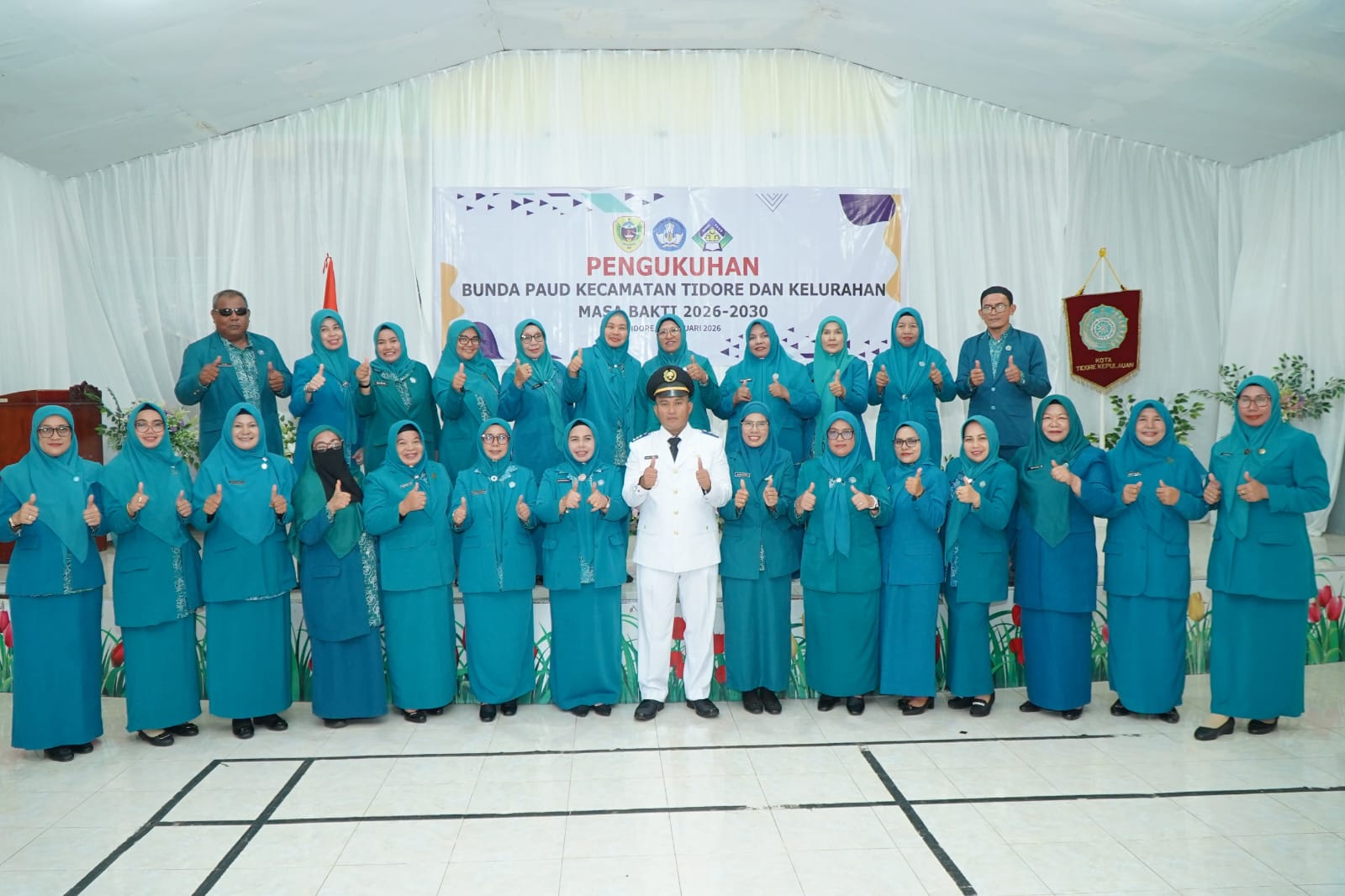 Faduli1.com-Ketua Tim Penggerak PKK Kota Tidore Kepulauan Hj. Rahmawati Muhammad Sinen resmi Melantik Ketua Tim Penggerak PKK Kecamatan Tidore Ny. Marliyani Sahril yang dirangkaikan dengan Pengukuhan Bunda PAUD Kecamatan Tidore dan Kelurahan se Kecamatan Tidore Masa Bakti 2026-2030, berlangsung secara khidmat di Aula Kantor Camat Tidore, Selasa (20/1/2026).