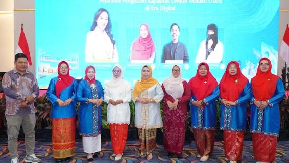 Faduli1.com – Ketua Tim Penggerak PKK Kota Tidore Kepulauan Ny. Hj. Rahmawati Muhammad Sinen didampingi Ketua I TP-PKK Ny. Sumiati serta Ketua III TP-PKK Ny. Nuraen Ismail Dukomalamo mengikuti Pelatihan Penguatan Kapasitas UMKM Maluku Utara di Era Digital yang berlangsung di Ballroom Bela Hotel, Ternate, Senin (20/4/2026).