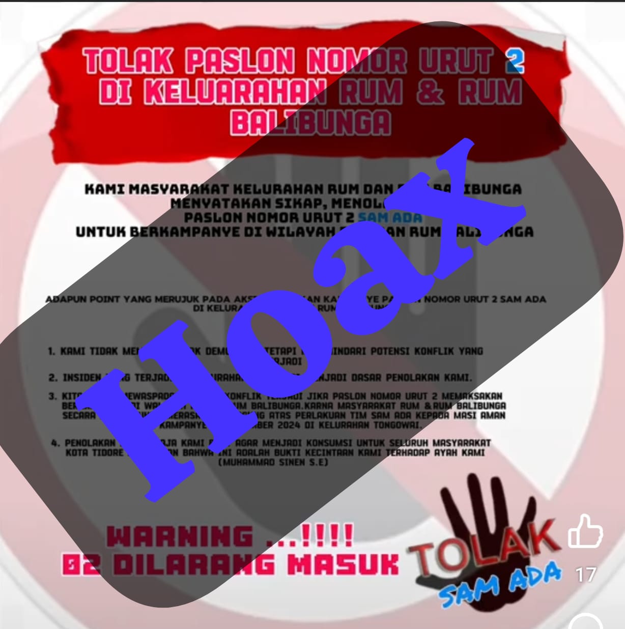 Saat di konfirmasi Sumitro salah satu tim pemenangan SAM-ADA Kelurahan Rum siokonora menegaskan bahwa penolakan terhadap Paslon SAM-ADA adalah hoaks.