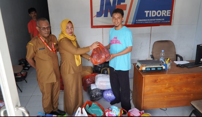 Bantuan tersebut disalurkan melalui Jasa Pengiriman JNE Cabang Tidore yang berlokasi di Kelurahan Tuguwaji dan diterima langsung oleh karyawan JNE pada Senin (8/12/2025).