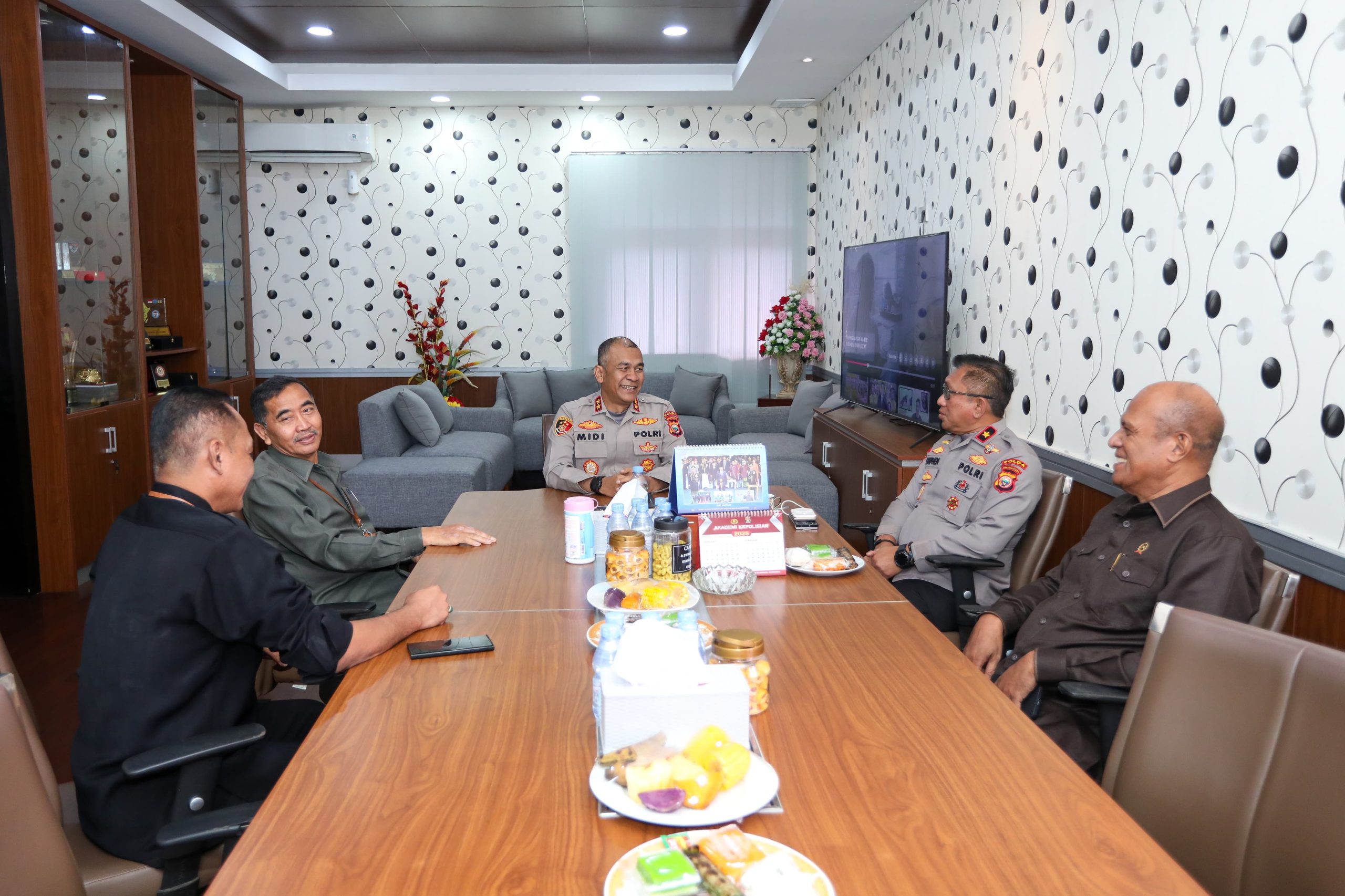 FaduliNews.com,Rabu/05/02/2025 Kepala Kepolisian Daerah (Kapolda) Maluku Utara, Irjen Pol. Midi Siswoko, S.I.K., menerima kunjungan silaturahmi Ketua Pengadilan Tinggi Maluku Utara, Sutaji, S.H., M.H., beserta rombongan bertempat di ruang kerja Kapolda, pada Rabu (5/2/2025).