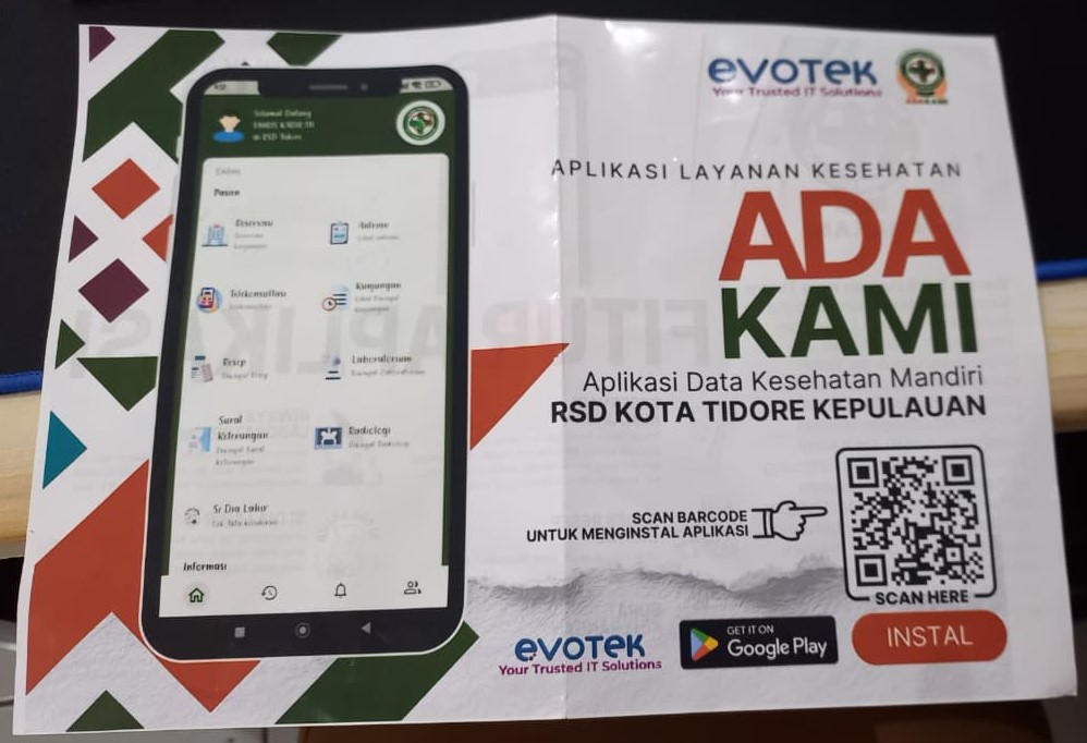 Dengan aplikasi ada kami ini, semua kebutuhan Kesehatan dapat diakses kapan saja, dimana saja, hanya dengan sentuhan di smartphone. Tidak perlu lagi datang langsung ke Rumah Sakit hanya untuk urusan administratif sederhana. Aplikasi Ada Kami ini dapat di download melalui Evotek, Google Play atau secara langsung dengan scan barcode di brosur yang telah disediakan.