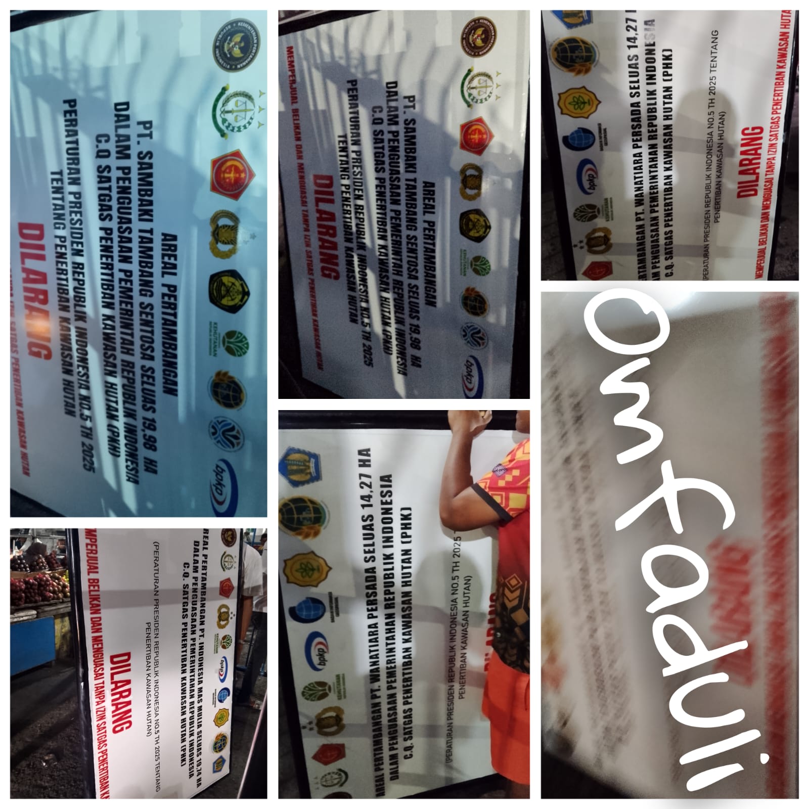 Papan-papan tersebut secara tegas mencantumkan keterangan areal pertambangan dan penguasaan dalam kawasan hutan, mengacu pada Peraturan Presiden Republik Indonesia Nomor 5 Tahun 2025 tentang Penertiban Kawasan Hutan, serta mencantumkan nama C.Q. Satgas PKH sebagai pelaksana penertiban.
