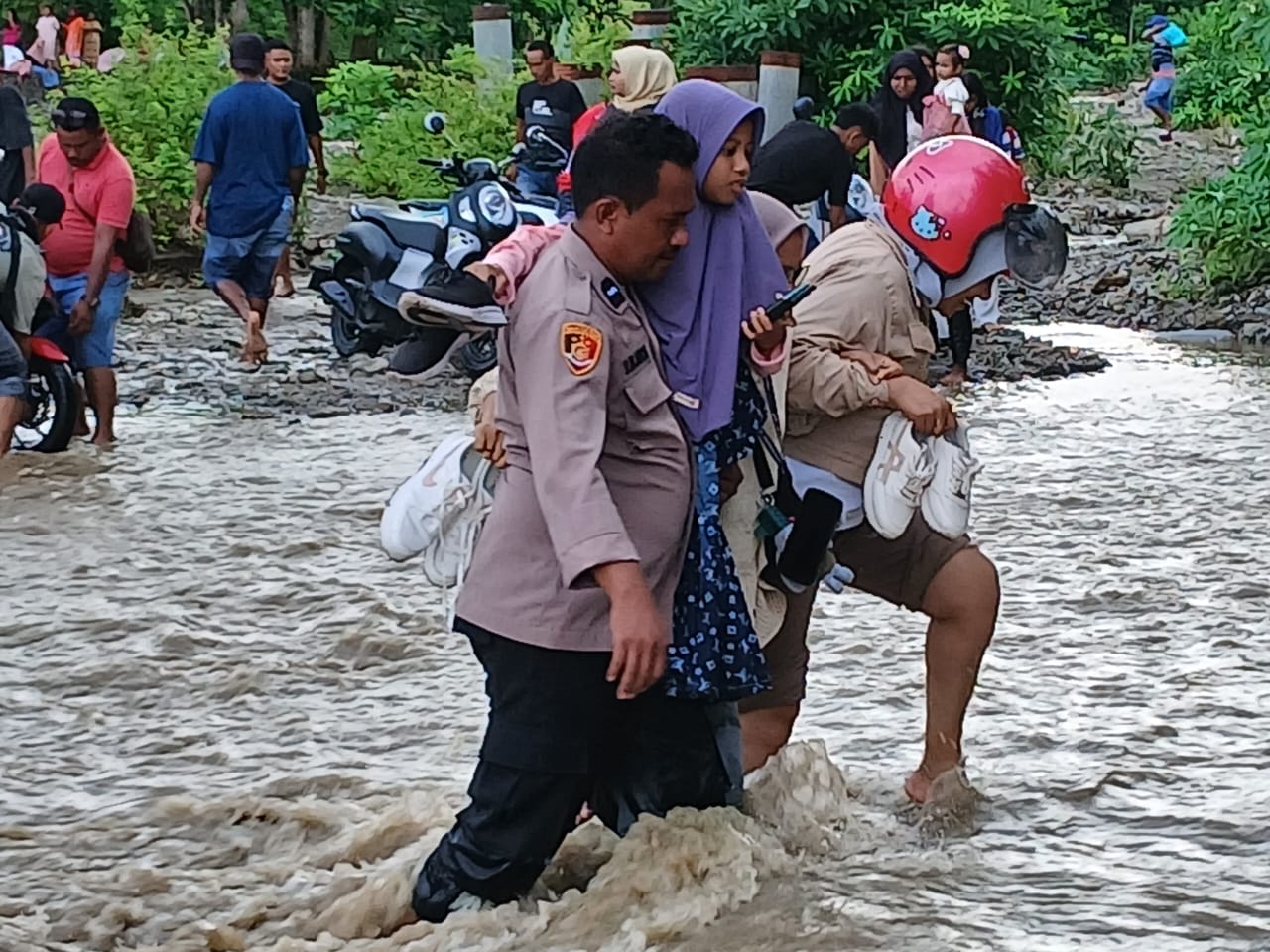 Selain membantu warga menyeberangi sungai dengan aman, personel di lapangan juga memberikan imbauan kepada masyarakat agar tetap waspada. Mereka mengingatkan warga untuk tidak memaksakan diri melintasi sungai jika kondisi arus masih deras, guna mencegah risiko yang tidak diinginkan.