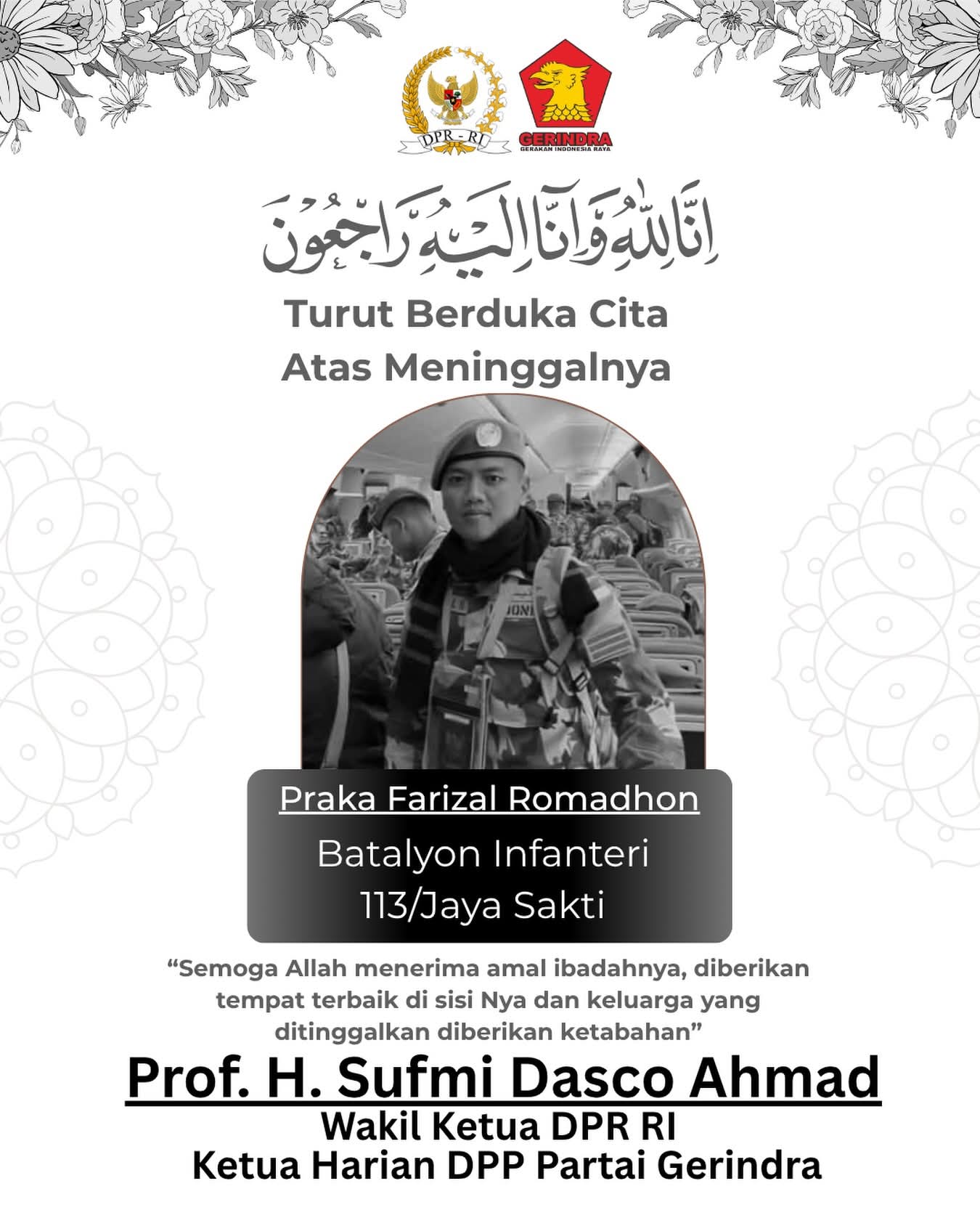 “Innalillahi wa inna ilaihi raji’un. Turut berduka cita atas meninggalnya Praka Farizal Romadhon saat menjalankan tugas mulia menjaga perdamaian dunia di Lebanon,” ujar Dasco dalam ucapan belasungkawanya.