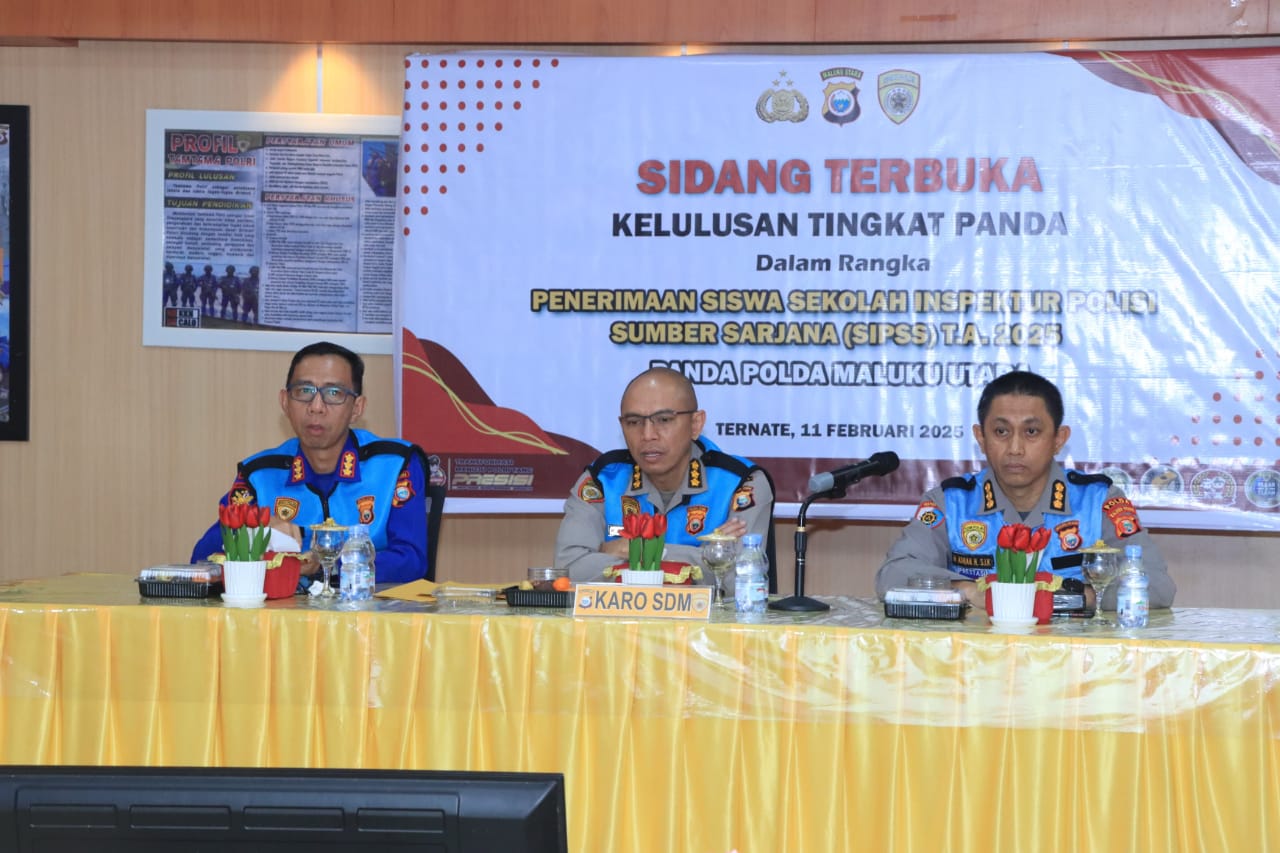 MALUT-FN,selasa/11/02/2025-Polda Maluku Utara melaksanakan sidang terbuka Kelulusan Tingkat Panda Seleksi Sekolah Inspektur Polisi Sumber Sarjana (SIPSS) Tahun Anggaran 2025 Panda Polda Maluku Utara melalui _zoom meeting_ yang bertempat di Ruang Bagdalpers Biro SDM Polda Maluku utara