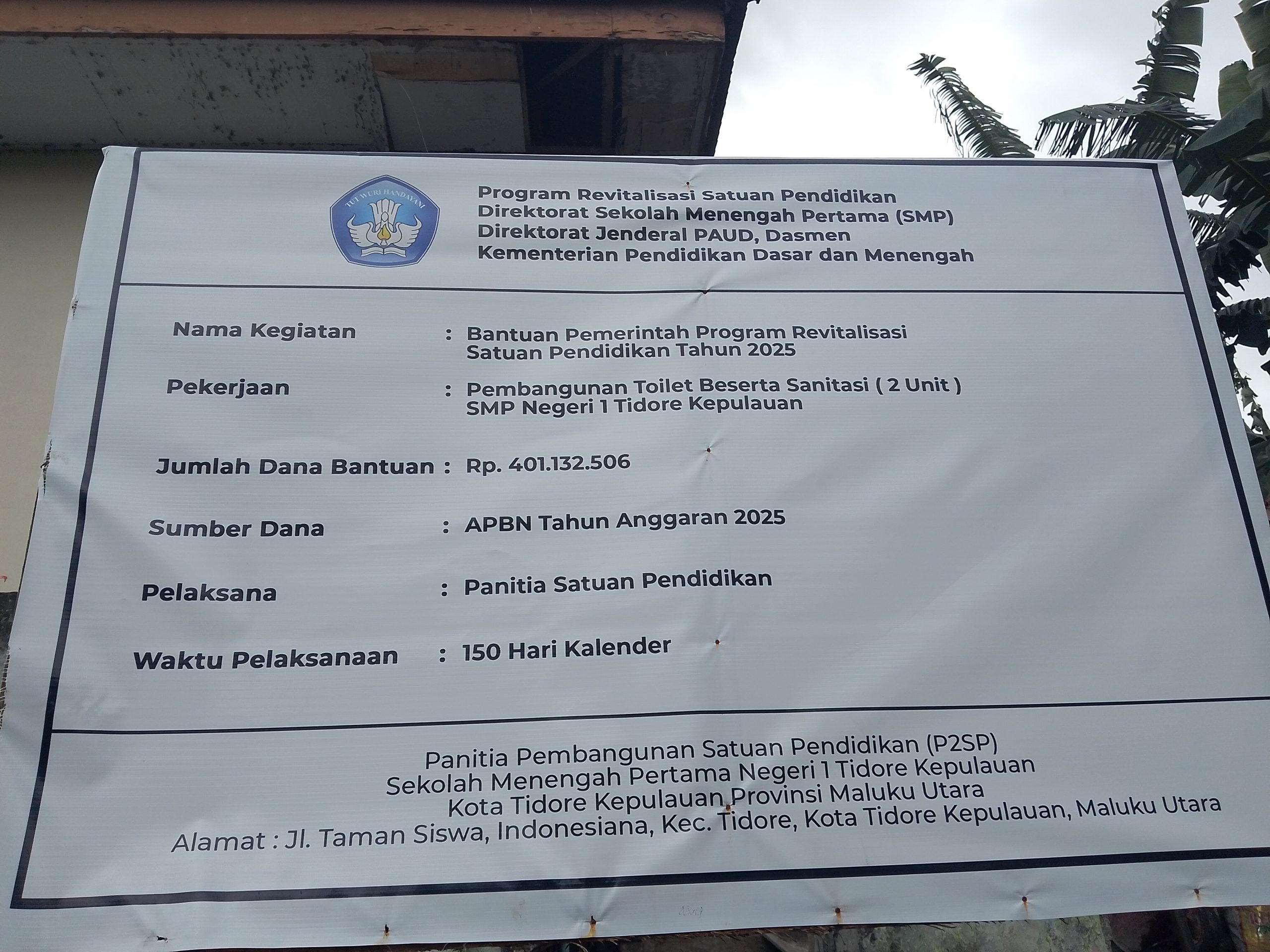 FaduliNews_Tidore Program revitalisasi satuan pendidikan terus digalakkan pemerintah pusat dalam rangka meningkatkan mutu dan fasilitas sekolah. SMP Negeri 1 Tidore Kepulauan menjadi salah satu sekolah penerima bantuan rehabilitasi tahun 2025 melalui Program Revitalisasi Satuan Pendidikan di bawah Direktorat Jenderal PAUD, Dasmen, Kementerian Pendidikan, Kebudayaan, Riset, dan Teknologi.