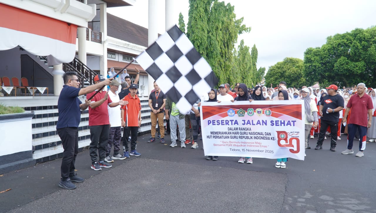 Tidore-FN,Dalam rangka Hari Guru Nasional dan Hari Ulang Tahun Persatuan Guru Republik Indonesia (PGRI) Ke 80, PGRI Kota Tidore Kepulauan menggelar Jalan Santai yang dilepas secara resmi Wakil Wali Kota Tidore Kepulauan Ahmad Laiman di halaman kantor Walikota Tidore Kepulauan yang menjadi start jalan santai tersebut dan diakhiri (finis) di Kawasan Pantai Tugulufa,Sabtu (16/11/2025)pagi.