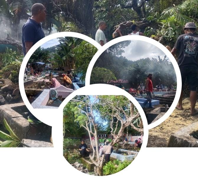 Sejak pagi, masyarakat datang membawa alat kerja seperti parang, cangkul, sapu dan sekop. Mereka membersihkan rumput liar, mengangkat batu, memangkas ranting pohon hingga merapikan makam keluarga.